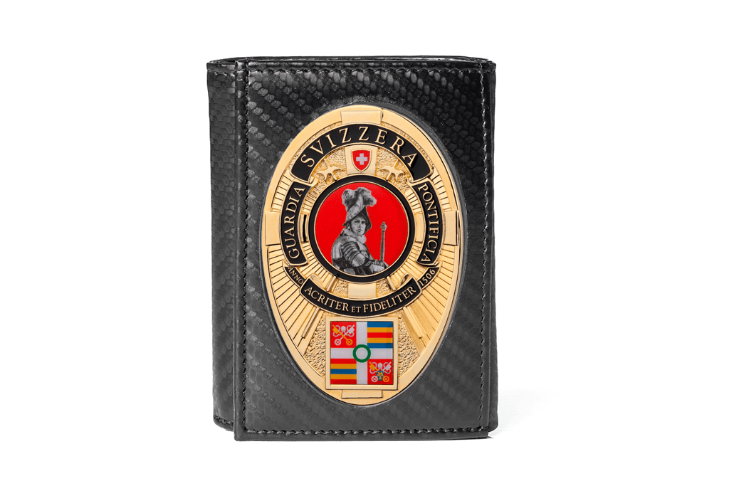 The recess for the badge is on the outside. The badge can be easily inserted into the recess from the outside. There is also a small coin pocket with a zip on the outside. Thanks to its compact dimensions, the cardholder with badge can easily be slipped into a trouser pocket or jacket pocket. This case with box also protects your credit cards against breakage or damage to the chip or magnetic strip, and the cards are RFID-protected in the aluminium box.