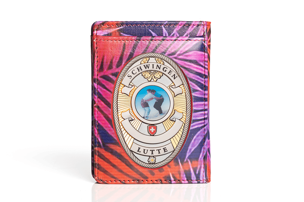 Handy “Nappa smooth leather case” in Hawaii Waikiki style. Elegant cowhide leather case with 1 large ID window inside and 3 credit card slots for at least 9 credit cards. The price includes a small lamp and a small retractable mini metal ballpoint pen, which can be inserted using an elastic band inside. The case is fitted with a press-stud fastener. The outside of the case is equipped with 1 additional ID window for ID cards. The badge is slid into the recess on the outside of this case from above. The case is supplied in a beautiful gift box. All our wallets are compatible and interchangeable with all our badges.