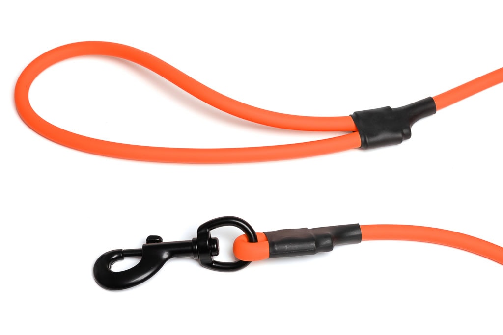 This dog leash is available in various lengths and is made of rubberised PVC material, making it very robust and durable. The extremely hard-wearing dog leash sits securely and comfortably in your hand, thanks to the soft hand strap. The sophisticated leash is available in the neon orange and yellow. Thanks to its bright orange or yellow colour, the leash is always clearly visible when your dog is out and about in nature. You can even use it for swimming as it is waterproof and weatherproof. The metal snap hook can be attached to all dog collars.