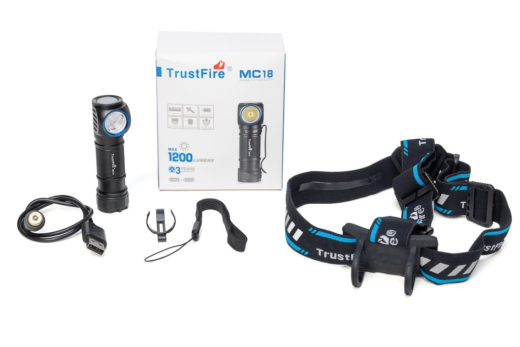 This versatile combination lamp from TrustFire, headlamp and torch in one with 1200 lumens and a powerful 18650 battery with 3000 mAh impresses with its compact design. Powerful light beam of 1200 lumens for optimum visibility even over long distances of up to 130 metres. Robust and compact: Durable housing made of anodised aircraft-grade aluminium. The MC18 headlamp from TrustFire combines the best of both worlds: It is both a powerful headlamp and a practical torch. The robust but compact housing made of anodised aircraft-grade aluminium is extremely durable and IPX8 rated, allowing the lamp to withstand even extreme weather conditions. The lamp is operated via a single button. The simple use and quick control of the 4 modes makes switching easy. The lamp can also be operated comfortably with gloves using the large button. The scope of delivery also includes the mountable hand strap and a metal holder / clip for a belt or backpack, as well as the headband with holder and the charging cable via USB.