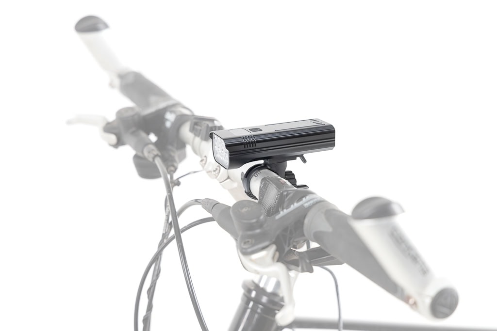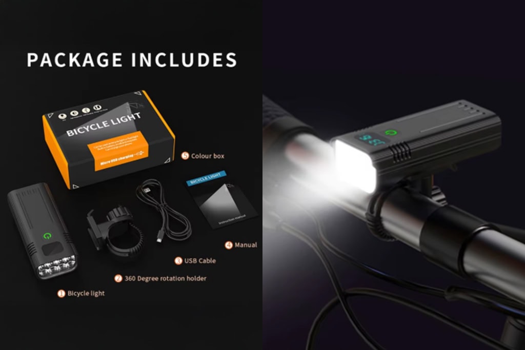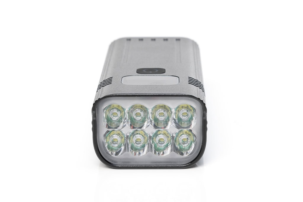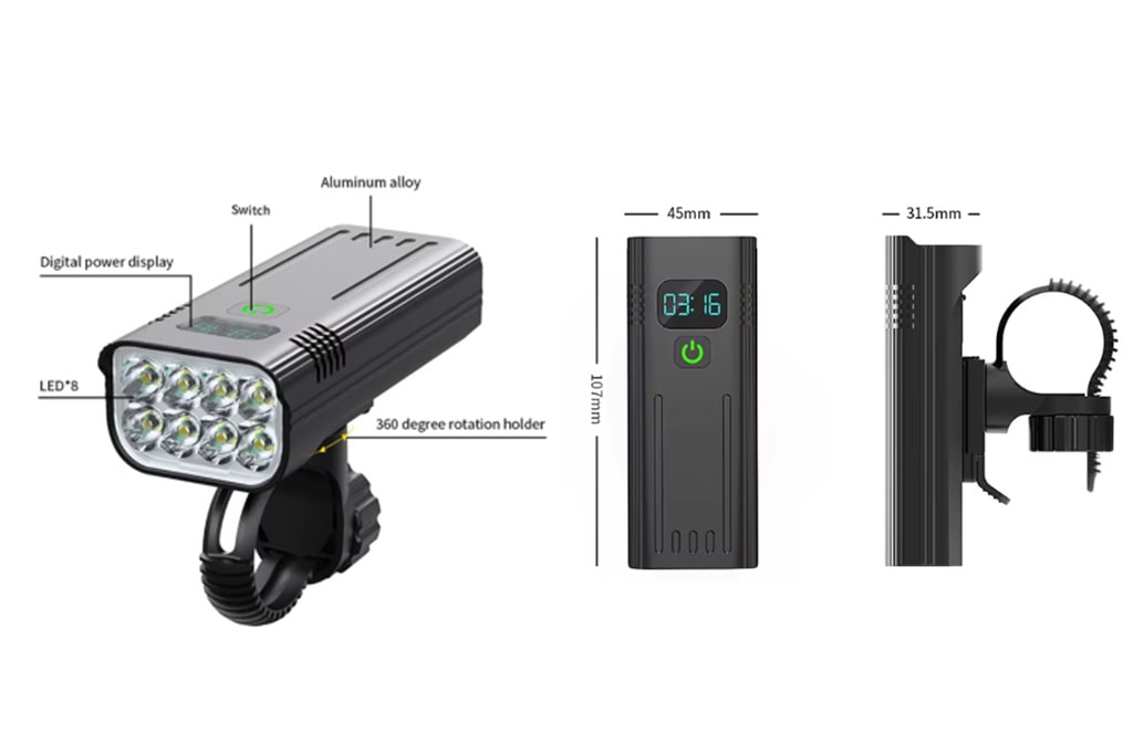 This rechargeable 8 LED bike light is a front light with quick mounting bracket. The bike light housing is made of 6063 aluminium. This bike light is rechargeable with its integrated 18650 battery with 4500 mAh and offers wide illumination with its impressive 2000 lumen beam. The waterproof front light with 8 LEDs will not let you down, whether in urban areas or in the countryside, you are always be safe on the road. The bike light has 5 different modes. The bright white light with 2000 lumens can be switched to bright white light 1200 lumens and the dimmable light with 600 lumens plus flashing light and SOS function. The light is easy to handle and can be operated with a single click. The light is IPX6 waterproof and equipped with a large LCD digital display for the battery charge indicator. With the built-in 4500 mAh lithium battery, you can even go on long bicycle tours without having to recharge the battery. The light duration of this bike light easily lasts from 5 hours in full light to a maximum of 22 hours without recharging. The bike light can be quickly recharged via USB cable. With its built-in 4500 mAh battery, this light also functions as a power bank, allowing you to charge your mobile phone in an emergency. A quick-release fastener is included in the scope of delivery for mounting this bike light. The quick-release click fastener can be quickly and easily mounted on the handlebars without tools. The bike light then simply needs to be clipped into place. The light can be removed just as quickly.