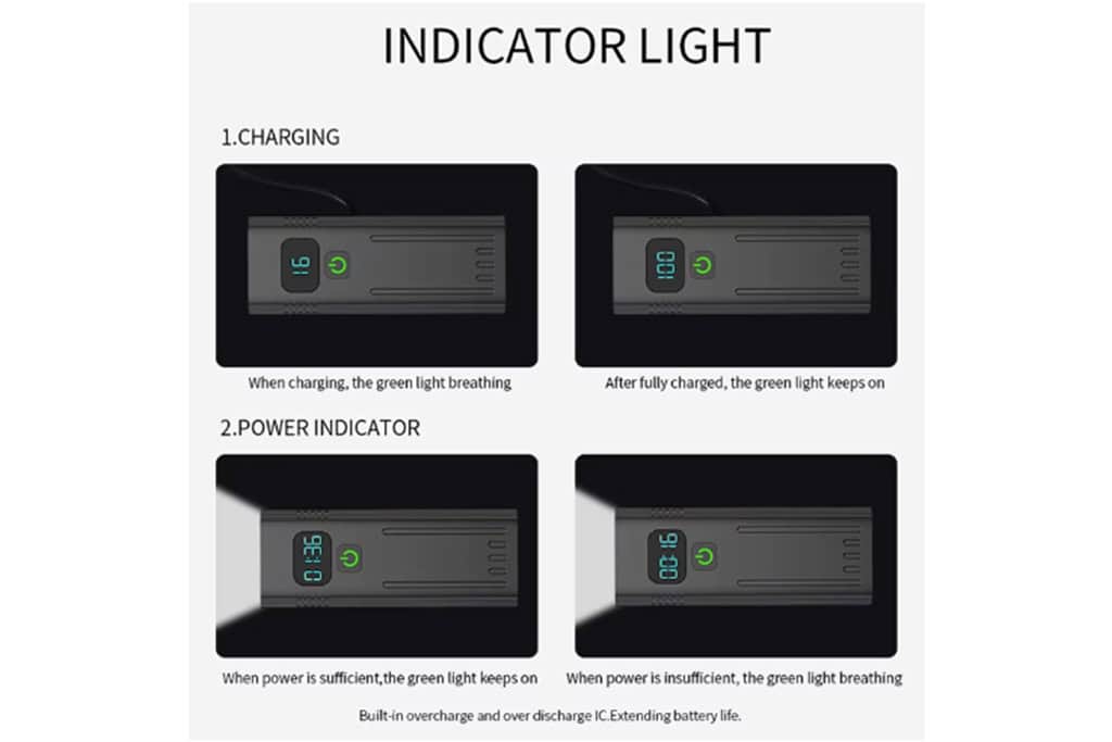 - Modes: 5 different functions 1. Bright white light 2000 lumens / 2. Bright white light 1200 lumens / 3. Dimmable light 600 lumen / 4. Flashing light / 5. SOS light