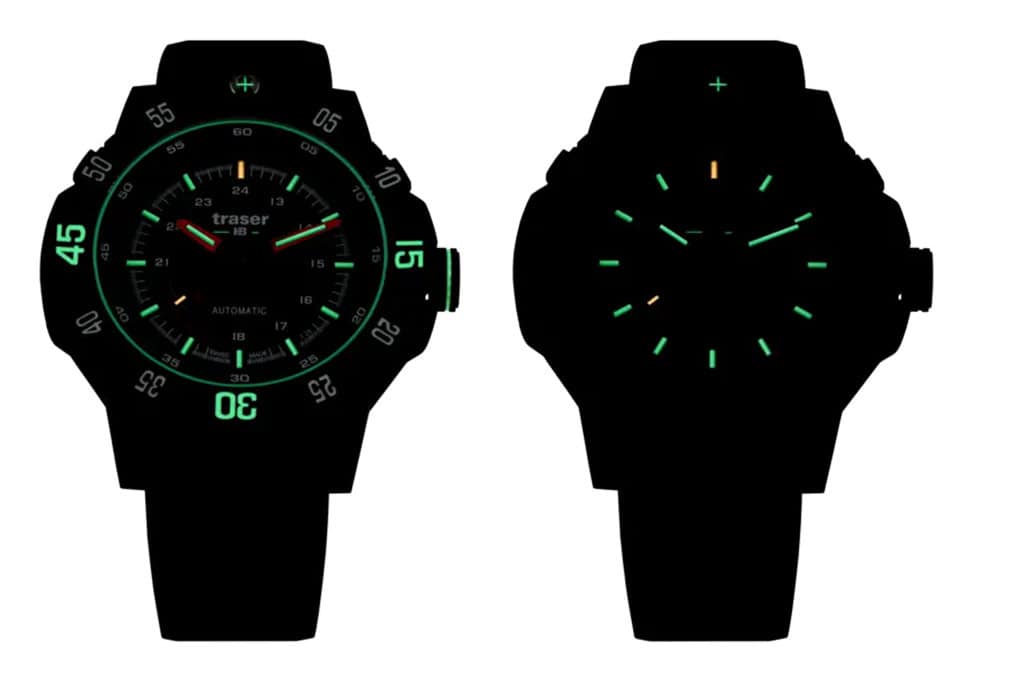 Featuring traser’s trigalight technology on the hands, indices, and as a crosshair insert in the bezel, the P99 A Tactical ensures constant readability without an external light source. Paired with a luminescent glass ring seal and a glowing crown marker, it remains reliably operable even in total darkness.