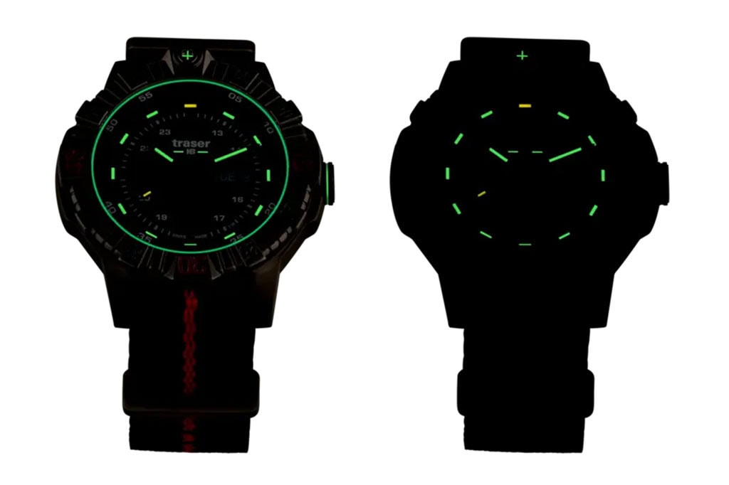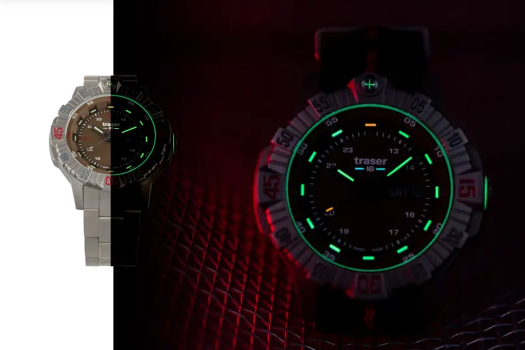 Traser’s trigalight technology provides constant luminosity on hands, indices, and bezel—without any external light source. A luminescent crystal gasket and a glowing crown ring ensure optimal operability, even in total darkness.