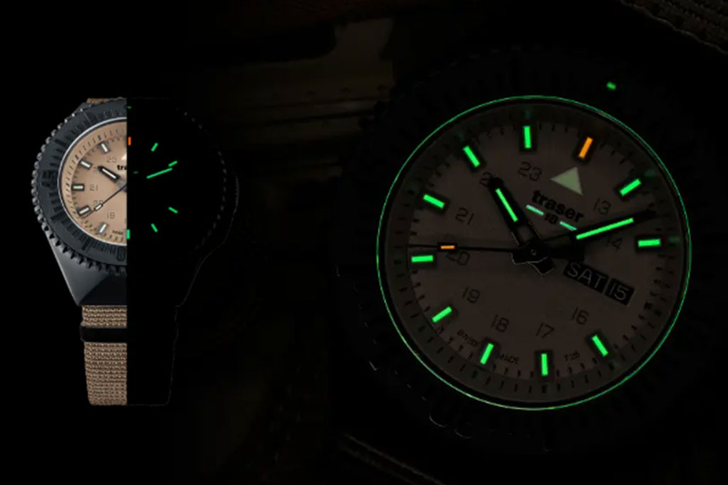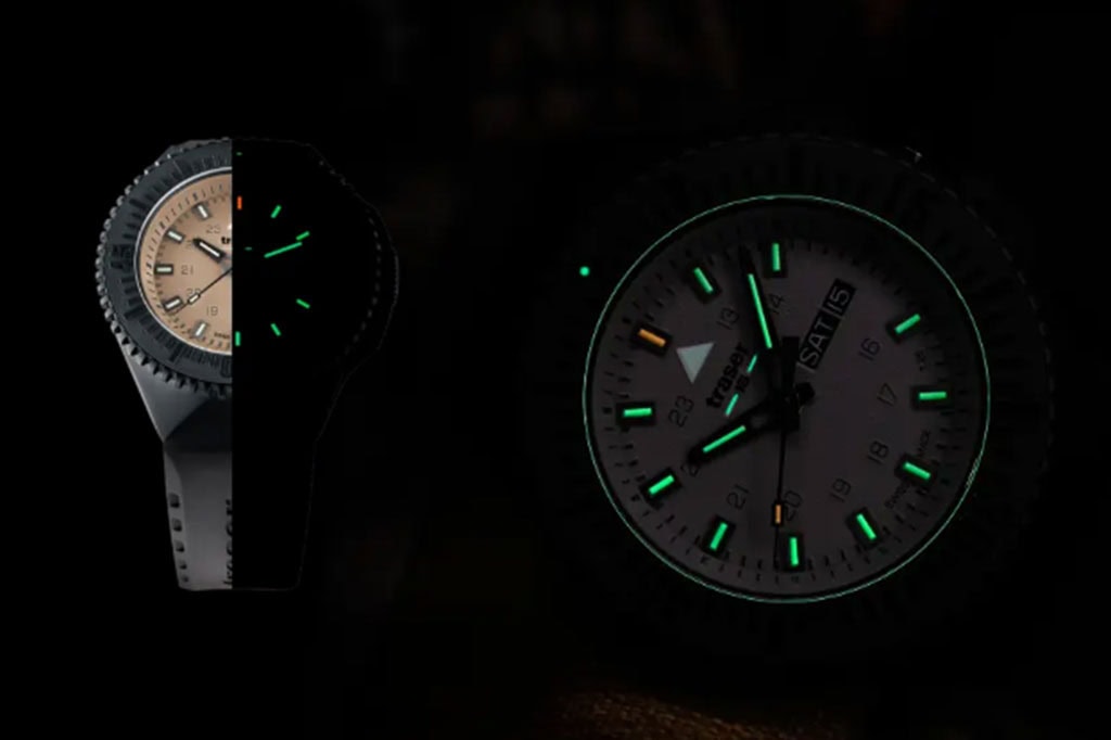 Inside the P69 Black Stealth beats a Swiss Made quartz movement that keeps precise time even under pressure – a reliable pulse in chaotic moments. Water-resistant up to 20 bar, it withstands the elements, from muddy trenches to the open sea. The bi-directional rotating bezel with trigalight marking becomes a tactical tool for precise time measurement, while the self-illuminating hands reveal the time even in complete darkness.