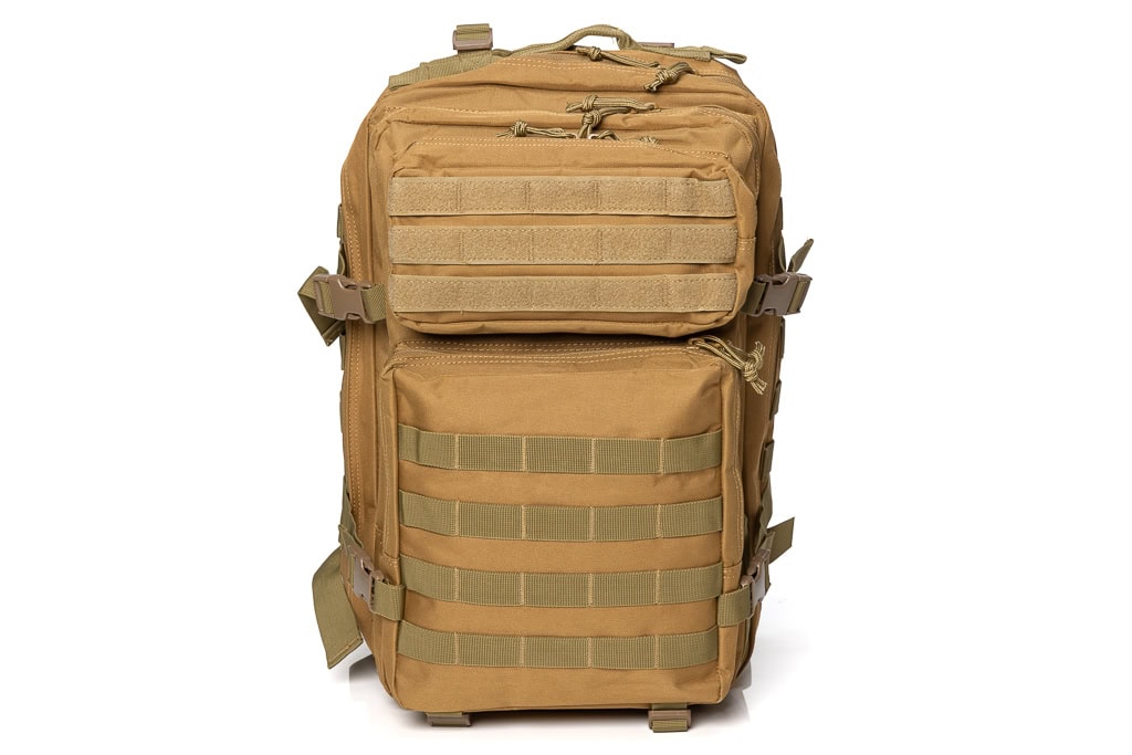 Sac à dos tactique avec système Molle d’un volume de 45 litres, dans différentes couleurs. Le sac à dos en tissu Oxford 900D est extrêmement robuste et durable. Avec deux grands porte-bouteilles en filet, avec cordon de serrage à l’extérieur. Le sac à dos est divisé en quatre compartiments à double fermeture éclair dans différentes tailles. Les sacs sont équipés de compartiments supplémentaires ou de poches en filet à l’intérieur. Le haut du sac à dos compte une poignée de transport et une ouverture/fermeture cachée pour la sortie du tube pour poche d’eau. Le grand compartiment principal du sac à dos est fermé par une fermeture éclair à double sens pour assurer un accès rapide aux objets stockés. Une poche en filet avec fermeture éclair figure à l’intérieur, ainsi qu’une grande poche en filet sans fermeture éclair et une grande poche plaquée pour la poche d’eau. Le deuxième grand compartiment à fermeture éclair est également équipé d’un compartiment à filet. Les deux petites poches à fermeture éclair sont aussi rapidement accessibles de l’extérieur et disposent d’une double fermeture éclair.