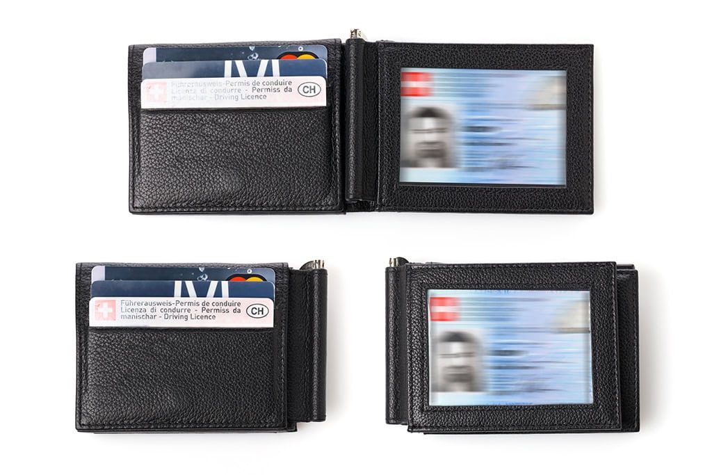 Étui en cuir de vache tendance avec deux fenêtres pour documents d’identité. L’étui a trois côtés repliables munis d’un bouton pression, pour au moins 24 cartes de crédit. Les billets peuvent facilement être coincés dans l’étui avec l’étrier métallique. Le badge peut être caché à l’intérieur ou porté de manière visible à l’extérieur.