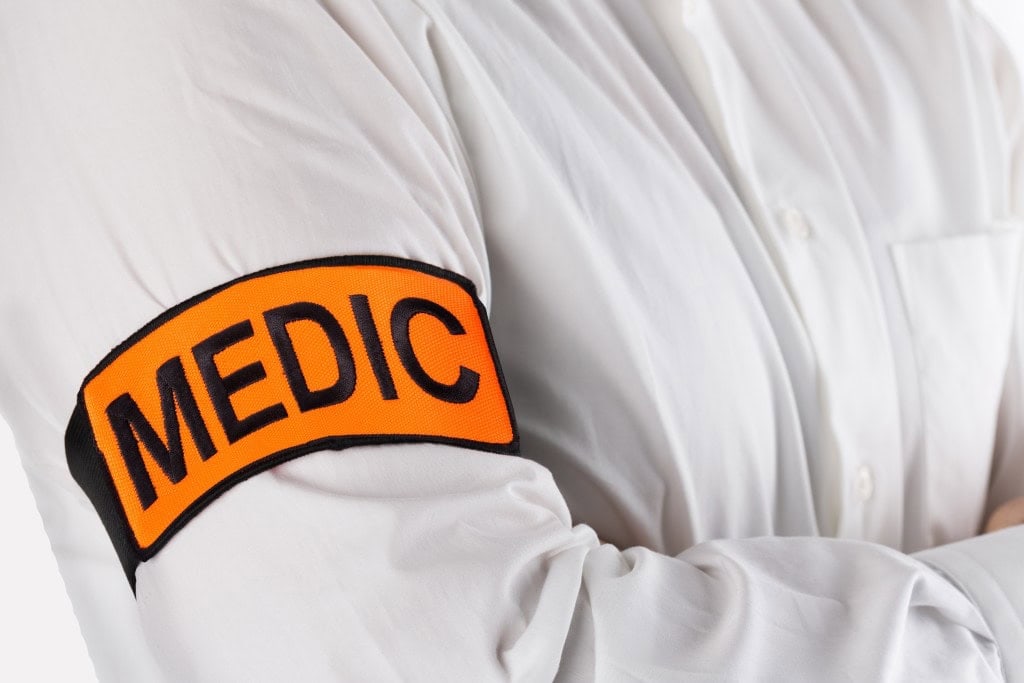 Braccialetto MEDIC elastico con velcro, misura unica (one size fits all), colore: arancione, altezza 6.5 cm, semplice e rapido da indossare sul polso.