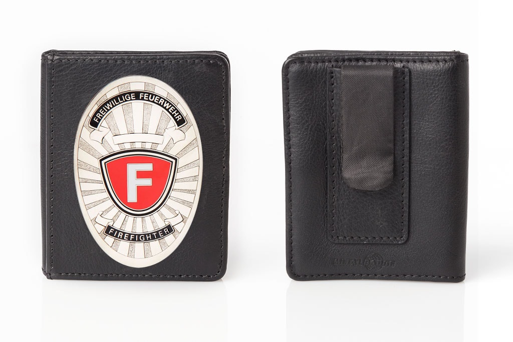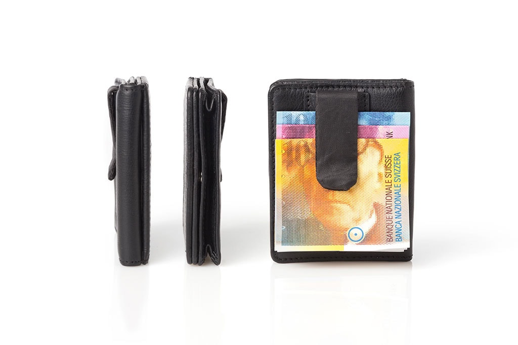 Gli scomparti per le carte di credito sono abbastanza grandi da ospitare fino a 12 carte. L’portafogli ha all’interno un bottone a chiusura automatica. Il badge in questo portafogli si trova sulla parte esterna. Sulla parte posteriore c’é un clip in metallo rivestito di tessuto per banconote. Il clip può anche essere utilizzato come supporto per applicare l’portafogli sulla cintura o su una giacca o camicia. Ottima qualità. Dimensioni: altezza 10 cm / larghezza 7.5 cm