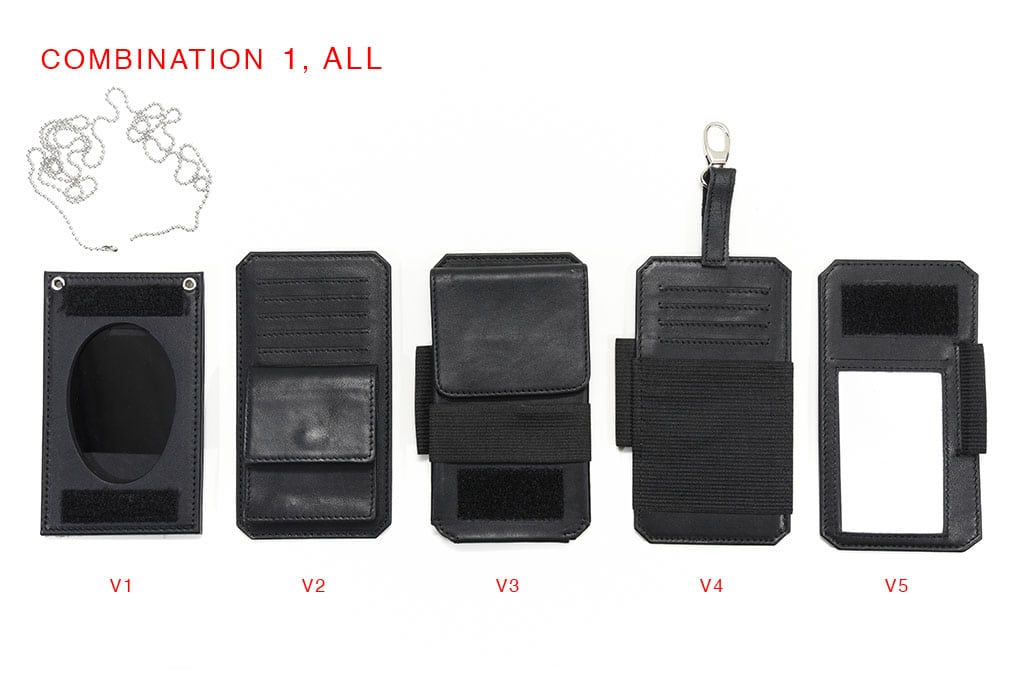 Un portafoglio combi ben ideato in soffice pelle bovina nera. Questo set composto da 5 pezzi può essere acquistato singolarmente o come set intero per l’appunto. I 5 portafogli sono costituiti dalla parte principale V1 con badge ed catenella in acciaio inox che colpisce e veramente unica. La catenella è dotata di una chiusura rapida. La parte principale V1 è dotata di velcro sulla parte posteriore. (Velcro parte morbida).