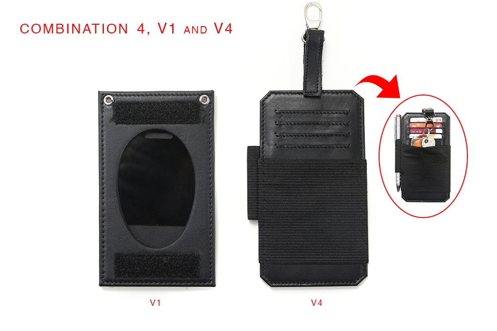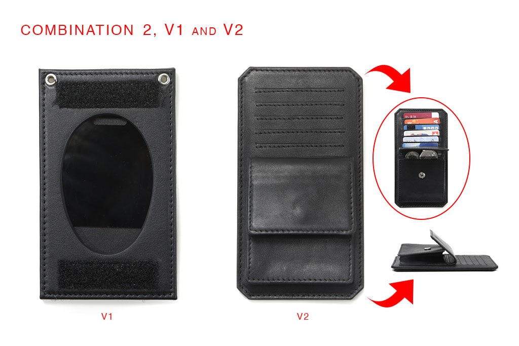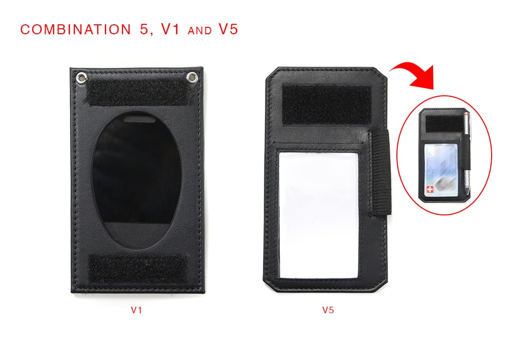 V5: Il portafoglio V5 dotato di finestrella per il documento con altezza 9.0 cm x larghezza 6.0 cm e un portapenne elastico così come una striscia di velcro delle dimensioni di 3.0 cm x 6.0 cm. Il portafoglio può essere incorporato alla parte principale V1 grazie alla striscia in velcro.