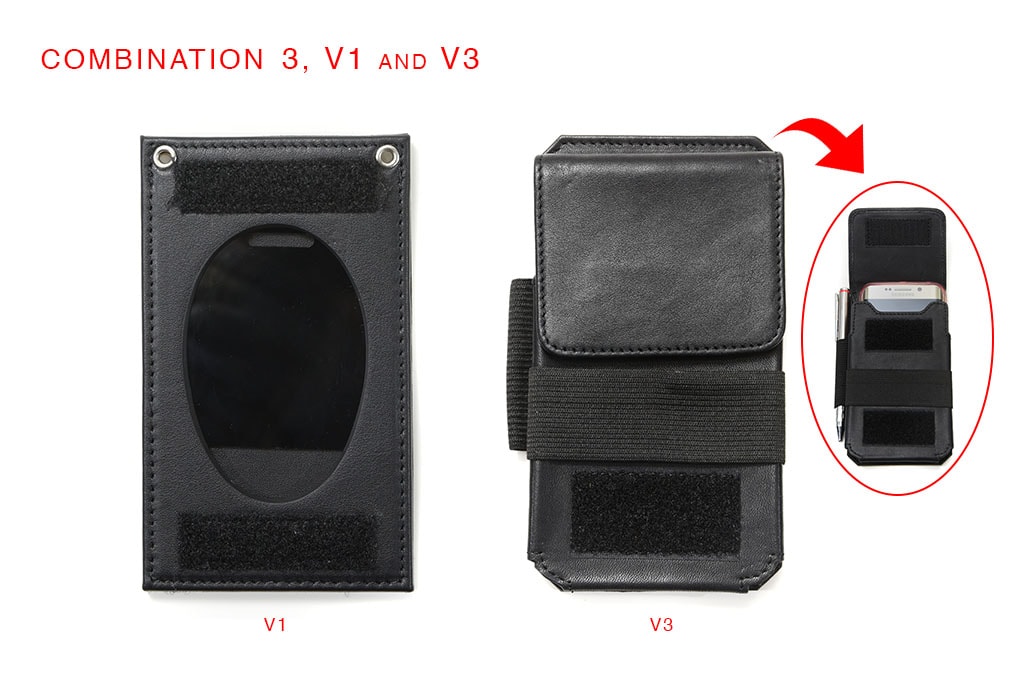 V3: Il portafoglio V3, dotato di una tasca portacellulare con richiudibile con velcro. Lateralmente c’è un portapenne elastico. Sulla parte esterna della tasca c’é del morbido velcro delle dimensioni di 5cm x 2.5 cm per diverse scritte come ad esempio: POLICE, POLIZEI, SECURITY, SECURITE, SICHERHEIT, SWITZERLAND ecc. Dimensioni della tasca portacellulare: larghezza 7.5 cm elastica x 14.5 cm.